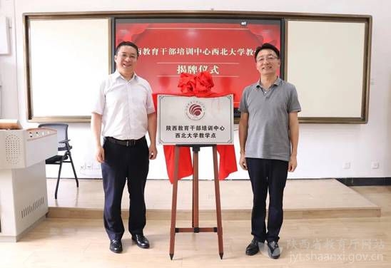 西北大学党委副书记、中华文化干部学院院长赵作纽和陕西教育干部培训中心主任李国良共同为陕西教育干部培训中心西北大学教学点揭牌。