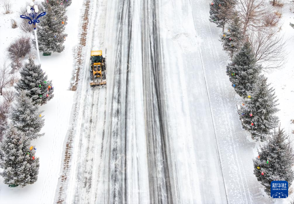 3月4日,在锡林郭勒盟正镶白旗,当地环卫部门组织车辆清雪(无人机照片)。
