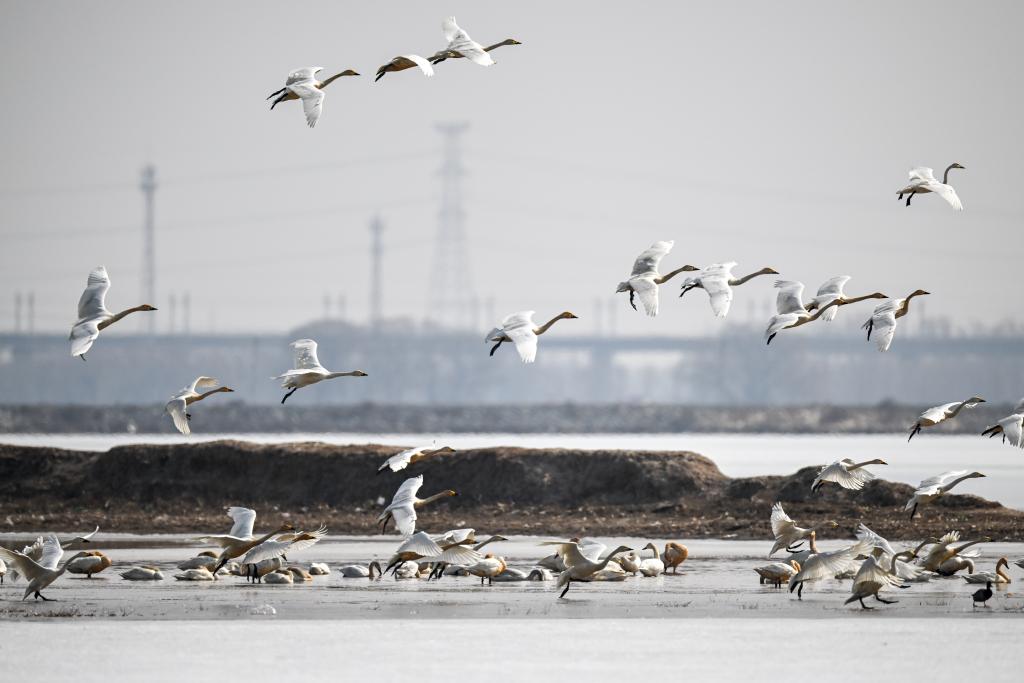 随着天气回暖,大批候鸟飞抵内蒙古呼和浩特市土默特左旗海流水库。候鸟时而休憩觅食,时而展翅飞舞,给当地带来勃勃生机。