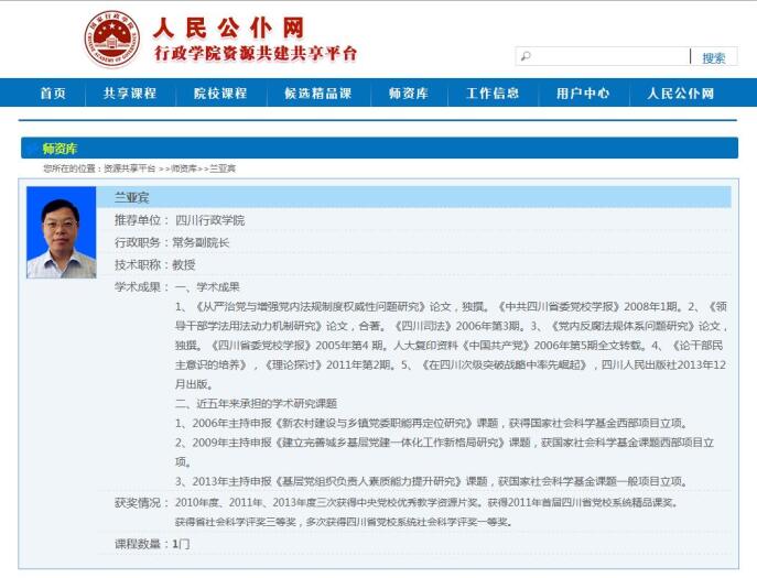 近日,国家行政学院公布了《2016年全国行政学院共建共享网络课程选用通知》。宜宾行政学院兰亚宾教授主讲《领导干部法治思维及其养成》入选国家行政学院共建共享网络课程,是四川行政学院报送入选的六门专题课之一。
