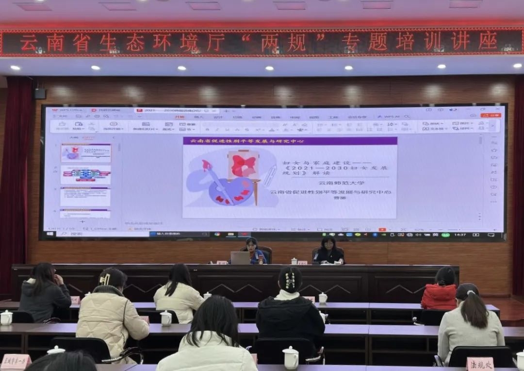 11月16日,省生态环境厅组织厅机关各处室和所属各单位干部职工开展《云南妇女发展规划(2021—2030年)》和《云南儿童发展规划(2021—2030年)》(以下简称“两规”)专题培训讲座。培训邀请云南师范大学社会学系副教授曹丽以“男女平等、儿童优先”为主题讲授了“两规”产生路径、基本发展、指导思想、基本原则和总体目标,以及发展领域和策略措施等重要内容,并对妇女与法律,儿童与法律保护中的反家庭暴力知识进行了重点讲解。